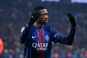 体育资讯2月14日讯 2025-26赛季法甲联赛第22轮,巴黎圣日耳曼客战雷恩,下半场登贝莱头球破门。
