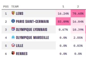 但根据opta的预测,巴黎夺冠的概率仍然高达83.09%,朗斯夺冠概率仅有16.24%。巴黎是五大联赛仅有排名不是榜首(比赛轮次相同),夺冠概率却是第一的球队。