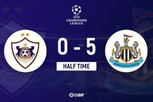 半场-纽卡暂5-0卡拉巴赫 戈登半场大四喜 特里皮尔助攻佳夫破门
